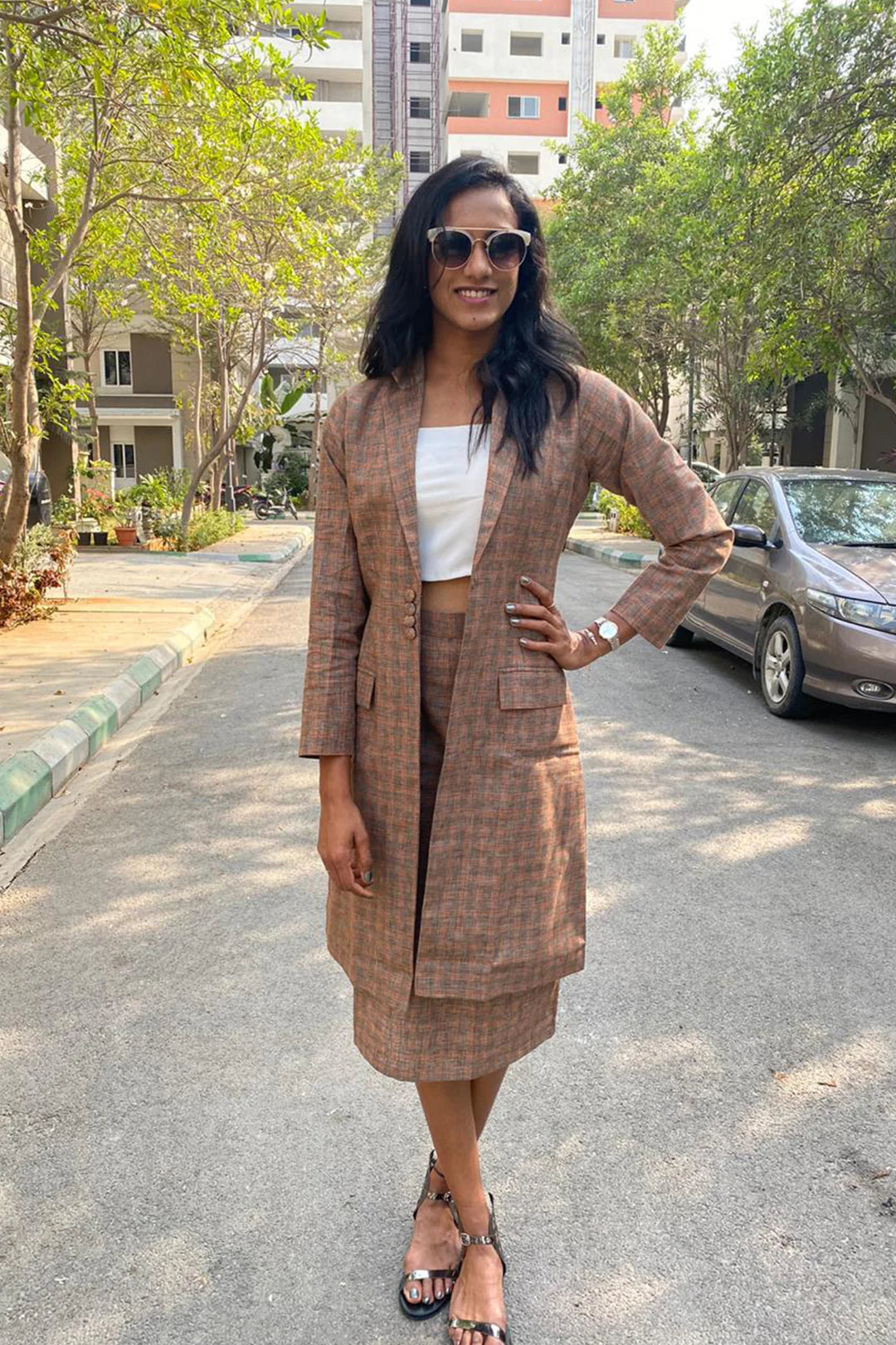 After looking at PV Sandhu in our brown-colored co-ord set of a skirt and a long blazer, we have realized that no one does casual day-time out better than PV Sandhu! She is totally acing this outfit with a casual pair of flats and gorgeous sunglasses.